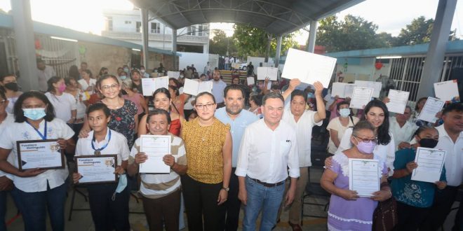 Motul, Yucatán, a 13 de octubre de 2022.- Continúa rindiendo frutos la Estrategia para la Atención del Rezago Educativo, es así como 169 jóvenes y adultos de Motul recibieron su certificado de primaria o secundaria, y 32 de ellos ambos niveles, que les respalda sus estudios y la posibilidad de continuar su formación, así como mejorar en el aspecto laboral y calidad de vida.