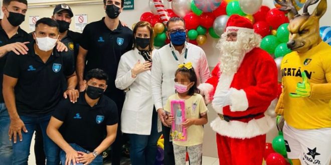MÉRIDA, Yuc., 26 de diciembre 2022.- En el marco de las fiestas navideñas, la Unidad Médica de Alta Especialidad (UMAE) del Instituto Mexicano del Seguro Social (IMSS) en Yucatán recibió la visita de jugadores de los Venados FC, quienes se unieron al personal de salud en la entrega de juguetes a pacientes pediátricos hospitalizados, que se encontraban recibiendo sus tratamientos o en el área de Consulta Externa.