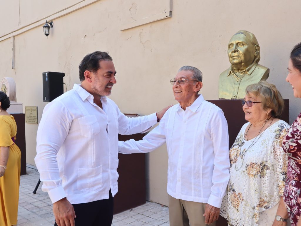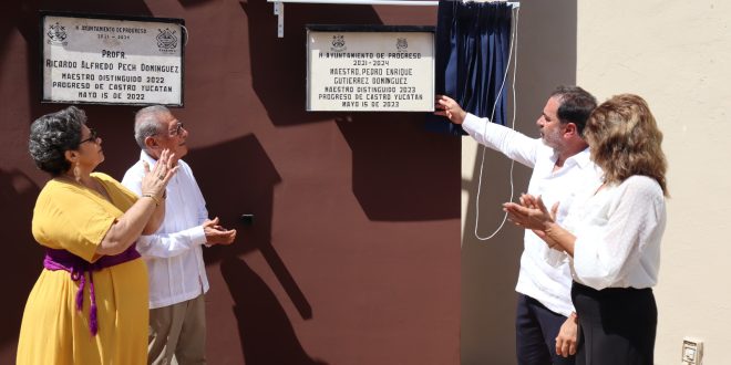 Así, en una emotiva ceremonia realizada en el Paseo de Arte, Educación, Cultura e Historia, el alcalde develó la placa conmemorativa que destaca la larga y fructífera trayectoria de Pedro Enrique Gutiérrez Domínguez, un docente que, entre otros logros, contribuyó a fundar la primera escuela primaria del fraccionamiento campestre en Flamboyanes y la primera escuela de educación especial de Progreso en la cual, se mantuvo trabajando hasta la fecha de su jubilación. “El trabajo de educador que usted ha llevado a cabo durante años ha permitido formar muchas generaciones de alumnos que hoy están poniendo su granito de arena para beneficio de Progreso, esa es la gran aportación que los maestros hacen a la sociedad y que hoy les queremos reconocer” señaló Zacarías Curi al felicitar al recipiendario de esta distinción.