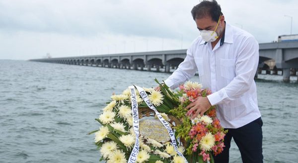 Con ofrenda floral, el alcalde del puerto de Progreso reconoce la labor de las fuerzas navales.