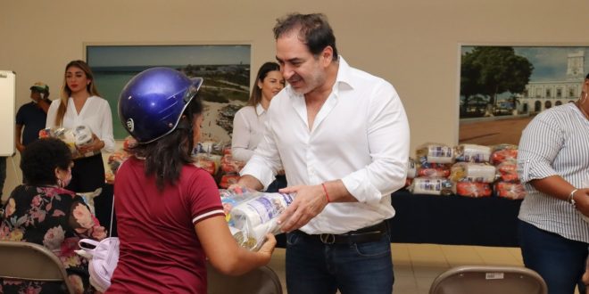 Progreso, Yucatán a 12 de enero de 2023. El programa municipal del DIF “Despensas para familias en situación vulnerable” continua este año, esto gracias a la buena administración de los recursos asimismo de la contribución de la ciudadanía al pagar diversos servicios municipales, resaltó el alcalde Julián Zacarías Curi al entregar hoy, junto con su esposa, la presidenta honoraria del DIF, Alma Rosa Gutiérrez Novelo, dicho apoyo a 60 beneficiarios.