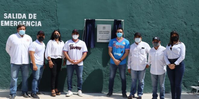Para continuar con el evento se hizo la develación de la placa conmemorativa para la casa de beisbol de Progreso, por remodelación y rehabilitación de este campo, como obra restaurada y puesta para el servicio de la comunidad deportiva.