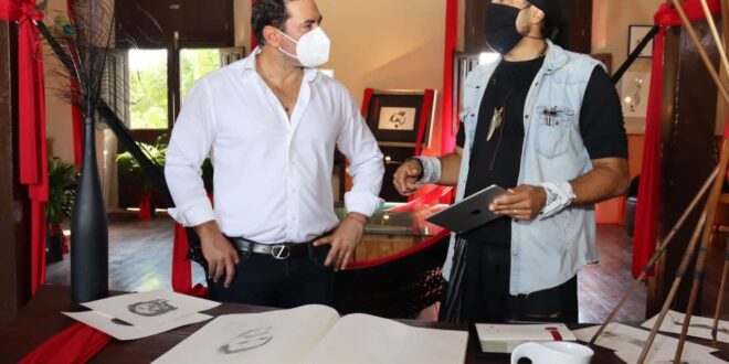 Progreso Yucatán a 18 de octubre 2021.- Está mañana el Alcalde, Julián Zacarías Curi, realizó un recorrido en la Casa de la cultura, acompañado de la Directora de Cultura Elda Margarita Hevia Li, y el Pintor Mexicano, Guidofarina, autor de la Exposición pictórica “Historias y reflejos en Café” expuesta en la galería de Alfredo Novelo Ceballos de la Casa de la Cultura.