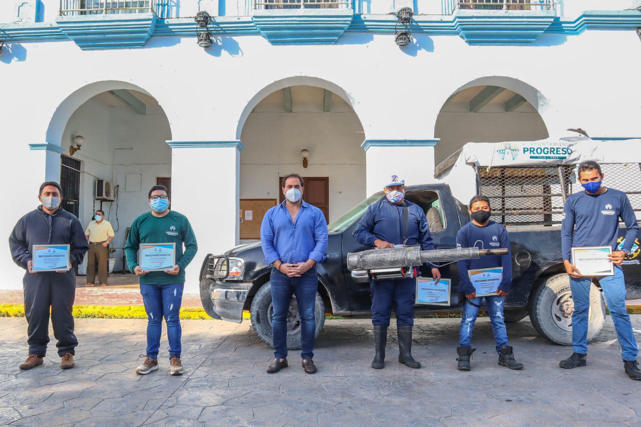 En ese sentido, David Gustavo Franco Sáenz, Ricardo Andreu Espadas Magaña, Carlos Adolfo Kuman Estrella, Román Cristóbal Ventura Cortina y Manuel Alejandro Recio Mancilla, quienes integran la cuadrilla de sanitizaciones, recibieron de manos del edil un reconocimiento por tan importante labor, en un acto que se realizó en los bajos del palacio municipal, en presencia del Director de Servicios Públicos y Ecología, Karim Dib López y la Subdirectora de Ecología, Mabel Aguirre Quinto.