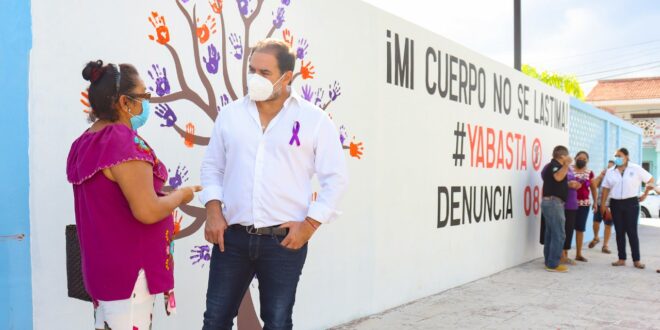 Progreso, Yucatán a 23 de noviembre de 2021. Esta mañana, el alcalde Julián Zacarías Curi acudió al parque de la colonia Vicente Guerrero en donde el Instituto Municipal de la Mujer (IMM) de Progreso inició ayer sus actividades de la “Semana de la no violencia”, con la creación de un muro que reforzará entre la comunidad un mensaje de respecto hacia las mujeres y la línea telefónica de denuncia contra agresiones que se encuentra también en dicha pared.