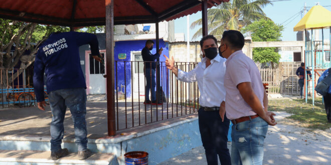 Progreso, Yucatán a 07 de abril de 2022.- El presidente municipal de Progreso, Julián Zacarías Curi en compañía del subdirector de Servicios Públicos de Ecología Julio Navarro Arguelles, acudieron hoy a la calle 39 entre 122 y 124, para supervisar la rehabilitación del parque “La Caleta”.