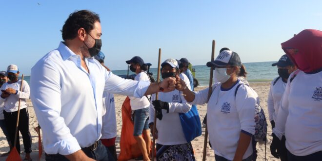 Progreso, Yucatán a 18 de abril de 2022.-Esta mañana el alcalde de Progreso, Julián Zacarías Curi acompañó a los 33 elementos del Programa de Limpieza de Playas y Ciénegas, en su labor por conservar las zonas costeras del puerto libres de residuos sólidos y contaminantes.