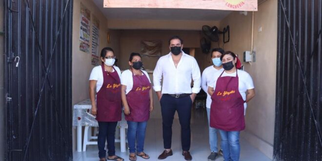 Progreso Yucatan a 14 de Marzo 2021.- Esta mañana el alcalde Julián Zacarías Curi visitó a la señora Luisa, dueña de La Yayita “Loncheria”, para platicar con ella y felicitar a su personal por la labor que realizan.