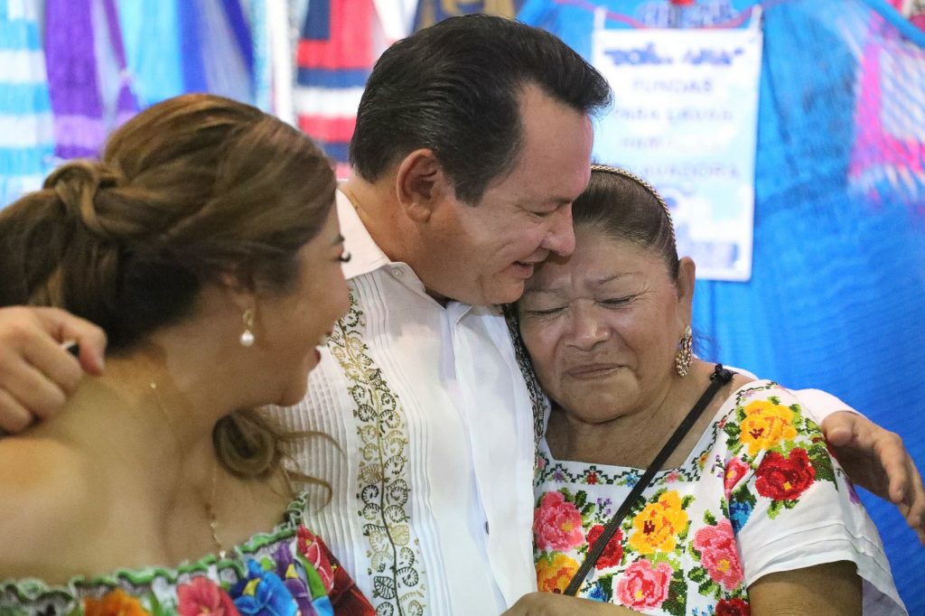 A su paso, Díaz Mena saludó a Ana María May Rosado, artesana que, al igual que la Feria, cumple 50 años participando como expositora. Con mucha emoción, la originaria del municipio de Buctzotz relató que, desde los 19 años, comenzó su historia ofreciendo hamacas elaboradas por ella misma y, tras cinco décadas, ha innovado y crecido de la mano de esta muestra, pues actualmente también oferta fundas para lavadoras.