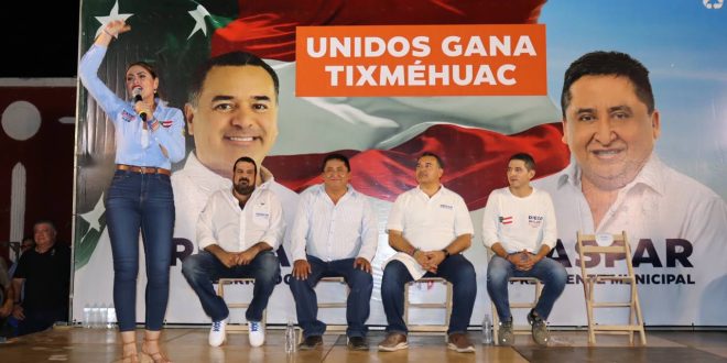 Tixméhuac, Yuc., 09 de mayo 2024.- Ante cientos de personas reunidas en el parque central de Tixméhuac, la candidata al Senado de la República, Kathia Bolio Pinelo, dirigió palabras a los productores del campo yucateco, comprometiéndose a regresar los apoyos para el campo y comunidades agrícolas dedicadas a la producción de la tierra yucateca.