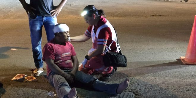 Al llegar al sitio los agentes municipales y observar que de la cabeza emanaba líquido hemático, solicitaron a los paramédicos de la Cruz Roja y procedieron a abanderar al dipsómano lesionado.