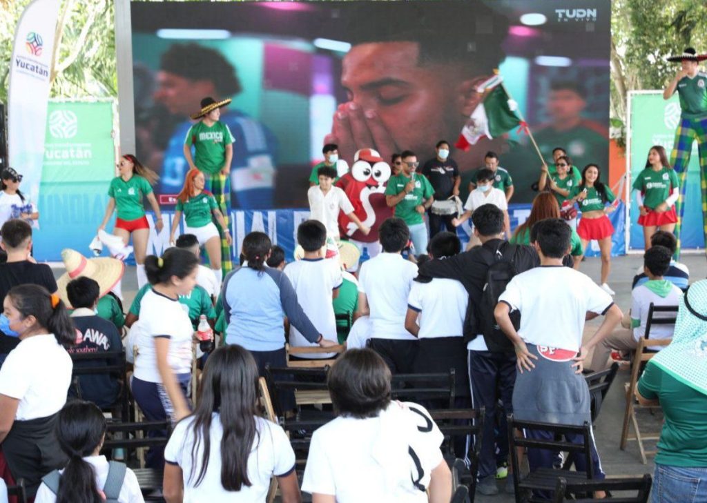 A través de una mega pantalla, los asistentes, quienes portaban la playera oficial para enviar desde Yucatán todo su apoyo a la Selección nacional, pudieron disfrutar de la transmisión del partido de México vs Arabia Saudita, en la cancha techada de la avenida Ricardo Palmerín.
