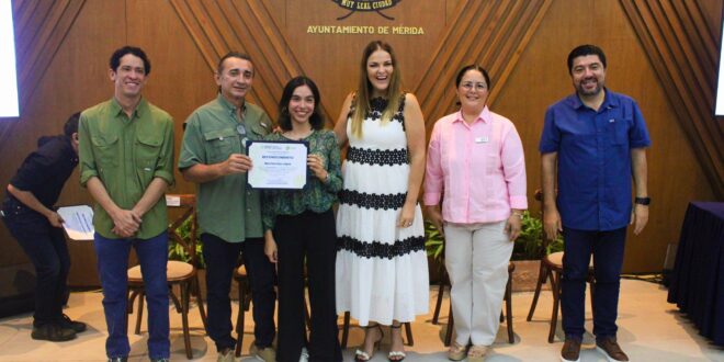MÉRIDA, Yuc., 22 de enero 2026.- La alcaldesa de Mérida, Cecilia Patrón Laviada, reconoció el trabajo de conservación a favor de los loros y la aportación a la ciudad del Centro de Difusión y Conservación Ambiental Proyecto Santa María y felicitó personalmente al director de esta asociación civil, Pierre Medina Arjona.