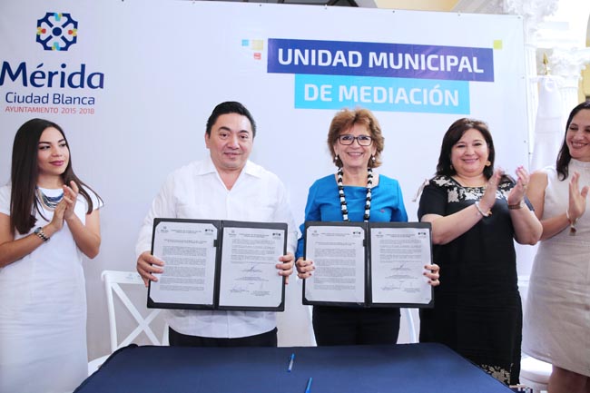 Durante el evento se llevó al cabo la firma de la Carta de Intención entre el Ayuntamiento de Mérida y el Consejo de la Judicatura del Poder Judicial del Estado de Yucatán y se entregó a la alcaldesa María Fritz, el Certificado y Clave de Registro de la Unidad Municipal de Mediación del Ayuntamiento de Mérida a manos del presidente del Tribunal Superior de Justicia Marcos Celis Quintal.