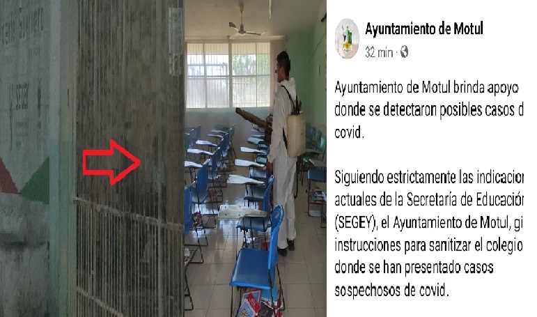 Siguiendo estrictamente las indicaciones actuales de la Secretaría de Educación (SEGEY), el Ayuntamiento de Motul, giró instrucciones para sanitizar el colegio donde se han presentado casos sospechosos de covid, indico la comuna a través de un comunicado de su pagina oficial.