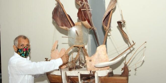 La obra de Jesús Peraza forma parte del acervo del Ayuntamiento de Mérida, se trata de una escultura realizada en 2017 con materiales variados como madera, hoja de coco, cristal y piedra.