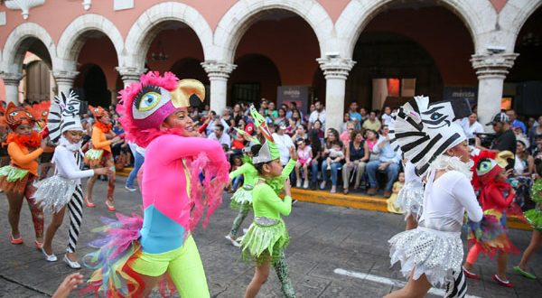 La primera sorpresa de la tarde fueron 12 personajes tipo “Puppets” vestidos de abejas y grillos que abrieron el primer bloque de comparsas. A estos les siguieron los integrantes de la Marching Band del Cepredey “Muuk Baalam, integrada por 85 niños y jóvenes de 12 a 18 años.