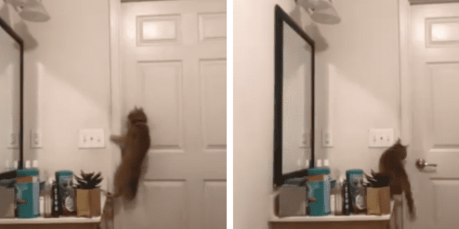 Estados Unidos.- Una estudiante de la Universidad de West Georgia, Estados Unidos notó como el gato de su compañera lograba escapar del cuarto de baño aún cuando la chica cerraba la puerta. Anciosa por saber como el felino se salía con la suya, decidió poner una cámara para resolver el gran misterio, y así logró captar la increíble maniobra que hacía el gato para escapar.