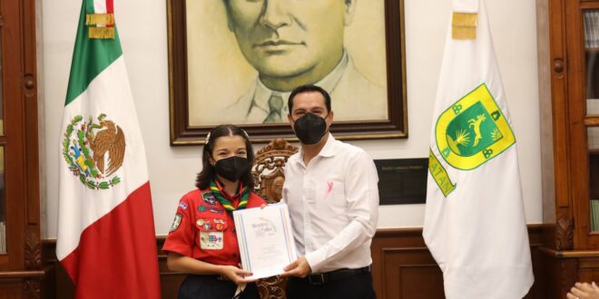 -En el marco de la Semana Scout 2021, el Gobernador Mauricio Vila Dosal encabezó la ceremonia con la joven escultista de 20 años, quien impulsa un proyecto para promover la conservación de la tortuga marina y proteger su hábitat.