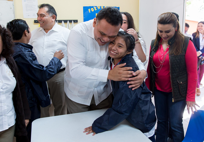 Acompañado de la Presidenta del Sistema para el Desarrollo Integral de la Familia (DIF) Yucatán, Sarita Blancarte de Zapata, y su hija Monserrat, el mandatario afirmó que durante su gestión se ha procurado una visión inclusiva en la enseñanza, con la finalidad de contrarrestar el rezago y ofrecer igualdad de oportunidades.