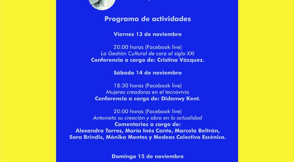 Mérida, Yucatán, 30 de octubre de 2020.- Conferencias magistrales, mesas de análisis y lectura de obra son las actividades que conforman el programa del 6° Encuentro La Mujer en la Escena Teatral “Antonieta en el 2021”, presentado vía streaming del 13 al 15 de noviembre por la asociación El Globo Arte y Cultura, con el apoyo de la Feria Internacional de la Lectura Yucatán.