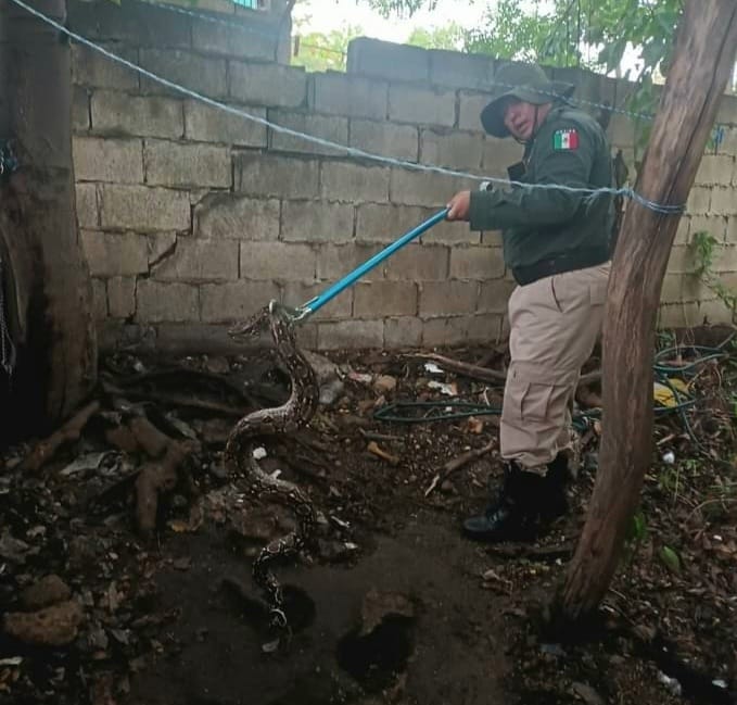 KANASÍN, Yucatán a 11 de julio 2023.- El ciudadano Marco Antonio P. reportó a la policía ecológica la presencia en su patio de una boa constrictor.