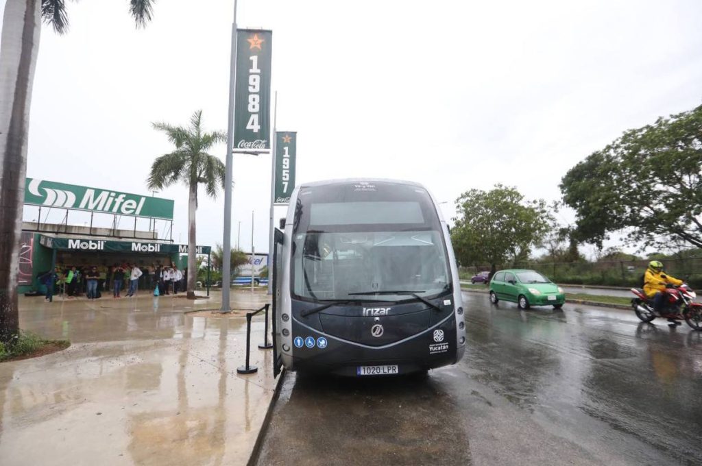 Mérida, Yucatán, 21 de julio de 2023.- Aficionados al béisbol y público en general podrán conocer de primera mano y experimentar los beneficios y comodidades con las que cuenta la moderna unidad de prueba del Ie-Tram, transporte público 100% eléctrica, la cual se encuentra en exhibición desde este viernes y hasta el domingo 23, a las puertas del Parque Kukulcán Alamo de esta ciudad, casa del equipo Leones de Yucatán de la Liga Mexicana de Béisbol (LMB).