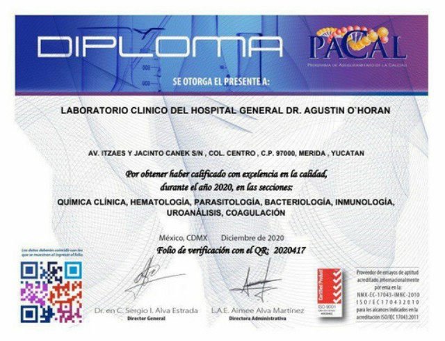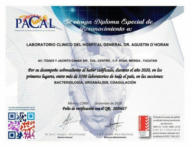 Mérida, Yucatán, 21 de diciembre de 2020.- El Laboratorio Clínico del Hospital “Doctor Agustín O’Horán” fue galardonado por la calidad y excelencia en su desempeño en las secciones de Química Clínica, Hematología, Parasitología, Bacteriología, Inmunología y Uroanálisis, mismo que también recibió la distinción “Rey Pacal” por haber calificado dentro de los mejores laboratorios del país.