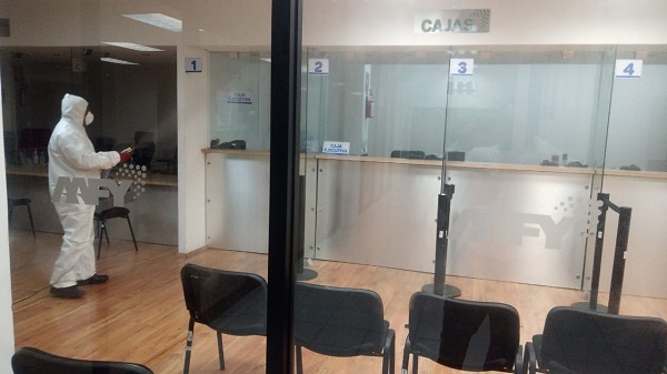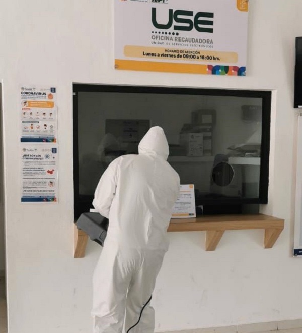 Con apoyo de un equipo técnico, se informó que se realiza la desinfección de mobiliario, equipo y superficies, labores que se desarrollan a profundidad. Estas tareas abarcan unidades de Servicio Electrónico (USE) y ventanillas de atención, los módulos de atención y pago de la Junta de Agua Potable y Alcantarillado de Yucatán (Japay) ubicados en el centro y poniente de la ciudad, además de otros edificios gubernamentales.