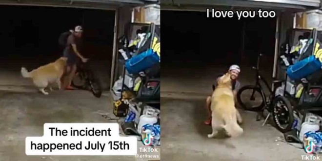“Eres el perro más cool que he conocido. Yo también te quiero. Eres un encanto… ¿dónde está tu papá?, no debería dejar el garaje abierto”, se escucha decir al hombre.