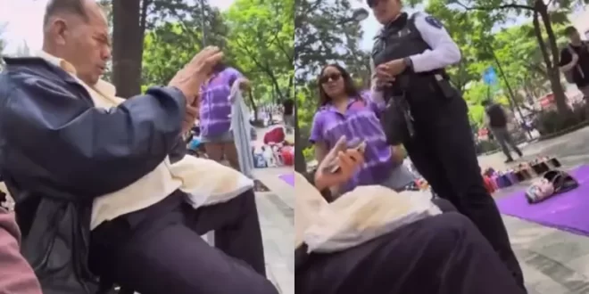 En las imágenes, que rápidamente se viralizaron en plataformas como TikTok y X, se observa a un adulto mayor sentado en una banca pública, aparentemente descansando, cuando es confrontado por una mujer identificada como vendedora ambulante.
