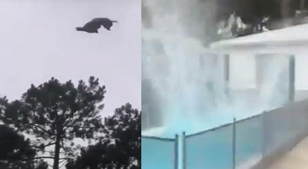La grabación se viralizó en redes sociales, en la cual se observa al cerdo ser lanzado desde la aeronave y caer brutalmente a la piscina.