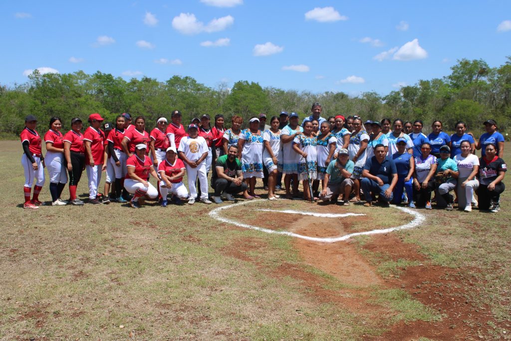 Yaxcabá, Yucatán, 17 de mayo de 2023.- Las Rieleras de Monterrey devolvieron la visita a las Amazonas de Yaxunah cuando se presentaron en el campo deportivo municipal donde surgieron estas jugadoras de softbol femeniles vestidas con el traje regional yucateco, el huipil y descalzas, mismas que se acompañaron de las Guerreras de Pisté y las Gladiadoras de Bokobá para hacer más entretenido el encuentro