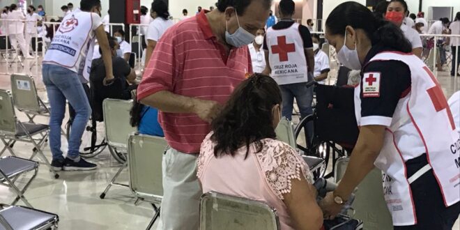 El apoyo que la Cruz Roja ofrece a los asistentes en el módulo de vacunación con los traslados en sillas de ruedas se da gracias al Club Rotario Mérida Itzaes y al Crit Yucatán que entregaron en comodato estos aparatos a la benemérita institución.