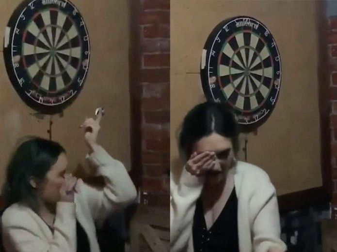 Aparentemente ebrio, el joven con mal puntería termina impactando el dardosobre el pelo de su novia, entonces ella lo provoca gritándole “¡poco hombre!”.Siguiendo el juego, el chico lanza otro dardo y éste cae en la cara de la mujer, ¡justo en su ojo!.