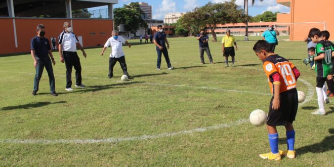 Mérida, Yucatán, 5 de noviembre de 2021.- La Escuela Modelo se encuentra lista, con los debidos protocolos sanitarios autorizados por la Secretaría de Salud (SSY), por lo que reabrió la Liga de Fútbol “Juan N. Cuevas”, hoy sábado con la patada inicial que dieron los organizadores, apostando por la reactivación económica que anunció el Gobierno de Mauricio Vila Dosal e incluye la reanudación de torneos.