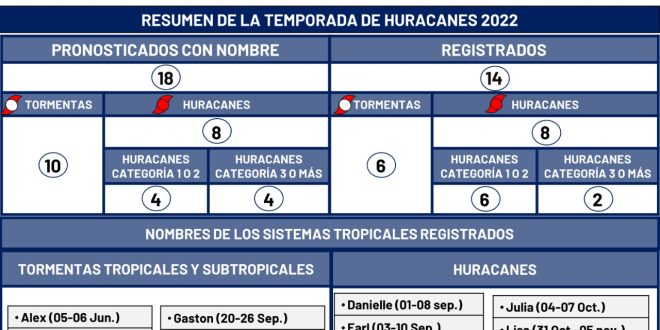 Finalizó el recuento de junio a noviembre con 14, por lo que se describió este ciclo como promedio; de este total, seis fueron tormentas tropicales; ocho, huracanes, cuatro de estos muy intensos, y también se detectó dos depresiones y un potencial ciclón, según el Sistema de Monitoreo y Alertamiento (SEMA).