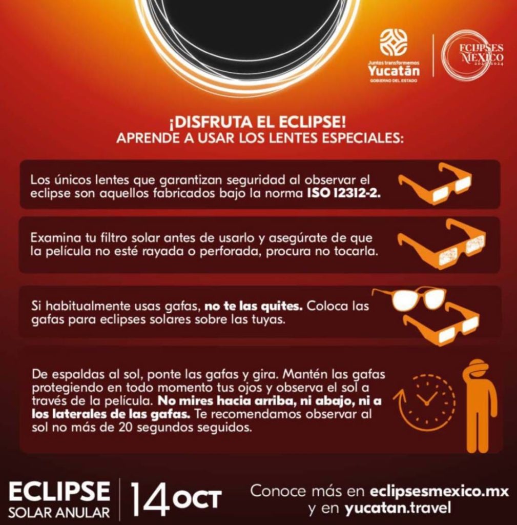 Mérida, Yucatán, 9 de octubre de 2023.- La Secretaría de Salud del estado y el Comité Yucatán de Eclipses 2023-2024 hicieron un llamado a la población a seguir las recomendaciones y medidas adecuadas para atestiguar de forma segura y preservar la salud visual durante el eclipse solar anular que se podrá observar en la entidad el próximo sábado 14 de octubre en la entidad.