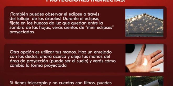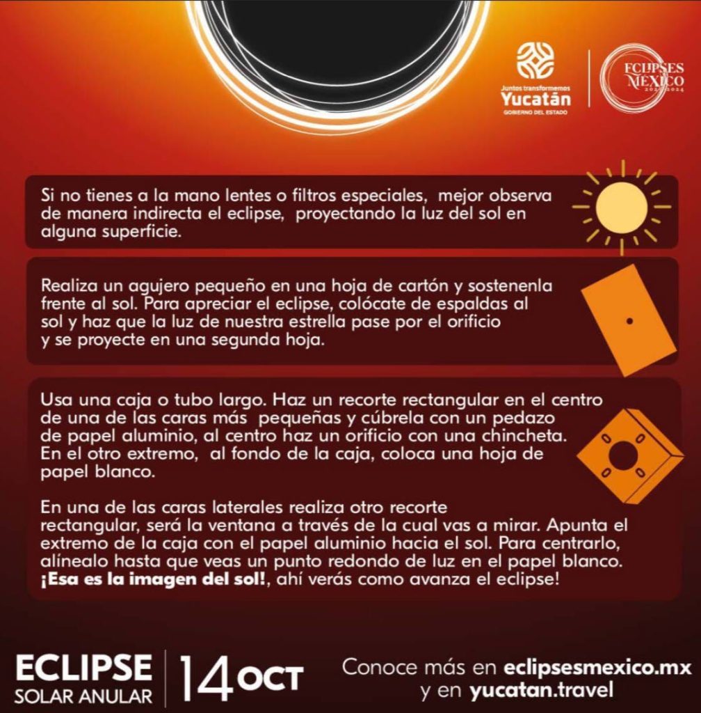 La coordinadora operativa del Comité Yucatán de Eclipses 2023-2024 afirmó que en caso de no contar con lentes certificados, este fenómeno se puede disfrutar a través de proyecciones indirectas, como en el reflejo que se observa de la luz que atraviesa por los huecos del follaje de los árboles; haciendo un enrejado con los dedos, reflejando el sol por el el orificio hecho a una cartulina o cartón y usando un espejo para proyectar la imagen en una pared blanca.