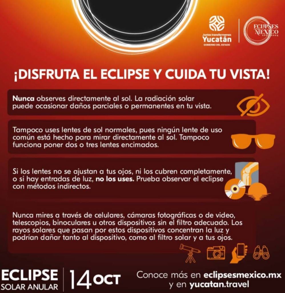 Mérida, Yucatán, 9 de octubre de 2023.- La Secretaría de Salud del estado y el Comité Yucatán de Eclipses 2023-2024 hicieron un llamado a la población a seguir las recomendaciones y medidas adecuadas para atestiguar de forma segura y preservar la salud visual durante el eclipse solar anular que se podrá observar en la entidad el próximo sábado 14 de octubre en la entidad.