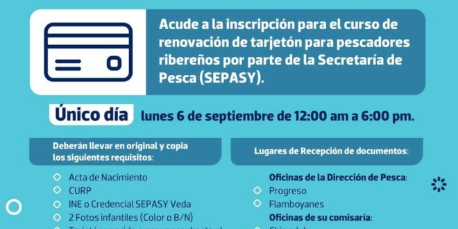 Progreso, Yucatán a 03 de septiembre 2021.- El Director municipal de Pesca, Franklin Franco Sánchez hace un llamado los pescadores ribereños de Progreso, Chicxulub, Chelem, Chuburná y Flamboyanes para acudir este 6 de septiembre a las inscripciones del curso de “seguridad marítima”, que impulsa la Secretaria de Pesca y Acuacultura Sustentable de Yucatán (SEPASY) para obtener la actualización del tarjetón.