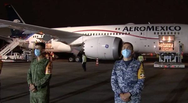 En este avión, con matrícula N964 AM, llegaron 200 ventiladores invasivos que compró el ISSSTE, 88 ventiladores donados para el sector privado al IMSS y a diferentes instituciones hospitalarias de los estados, 300 mil pruebas PCR de la compañía china de la Universidad de Nanjing para el Instituto de Diagnóstico y Referencia Epidemiológicos (INDRE) para empezar a monitorear la pandemia.