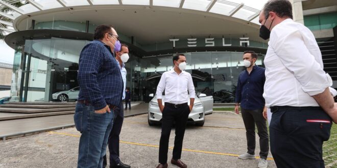 -El Gobernador Mauricio Vila Dosal visitó el centro de ventas y servicio instalado en Mérida por la firma estadounidense Tesla, dedicada al diseño, fabricación y venta de vehículos eléctricos.