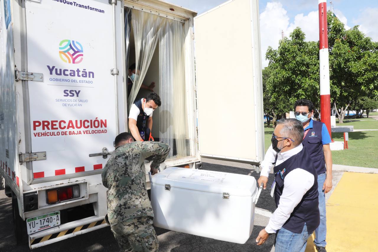 Acompañado del coordinador Estatal para la Vacunación Covid-19, capitán de Corbeta Carlos Gómez Montes de Oca, Hernández Fuentes constató la descarga del lote a cargo del personal del Ejército, el cual fue colocado en un camión thermoking de la SSY, para luego ser trasladadas al almacén estatal de vacunas, desde donde se distribuirán a los lugares donde se aplicarán.