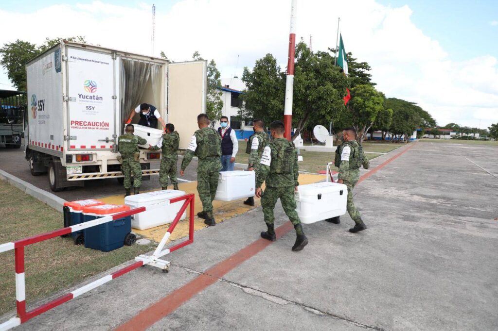 Acompañado del coordinador estatal de Vacunación, capitán de Corbeta Carlos Gómez Montes de Oca, y el director de Prevención y Protección de la Salud de la SSY, Carlos Isaac Hernández Fuentes, Sauri Vivas constató la descarga de las vacunas, a cargo del personal del Ejército, las cuales se colocó en un camión thermoking de la dependencia, para luego trasladarlas al almacén estatal, desde donde se distribuirán hacia los lugares para aplicarlas.