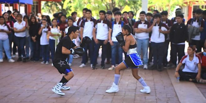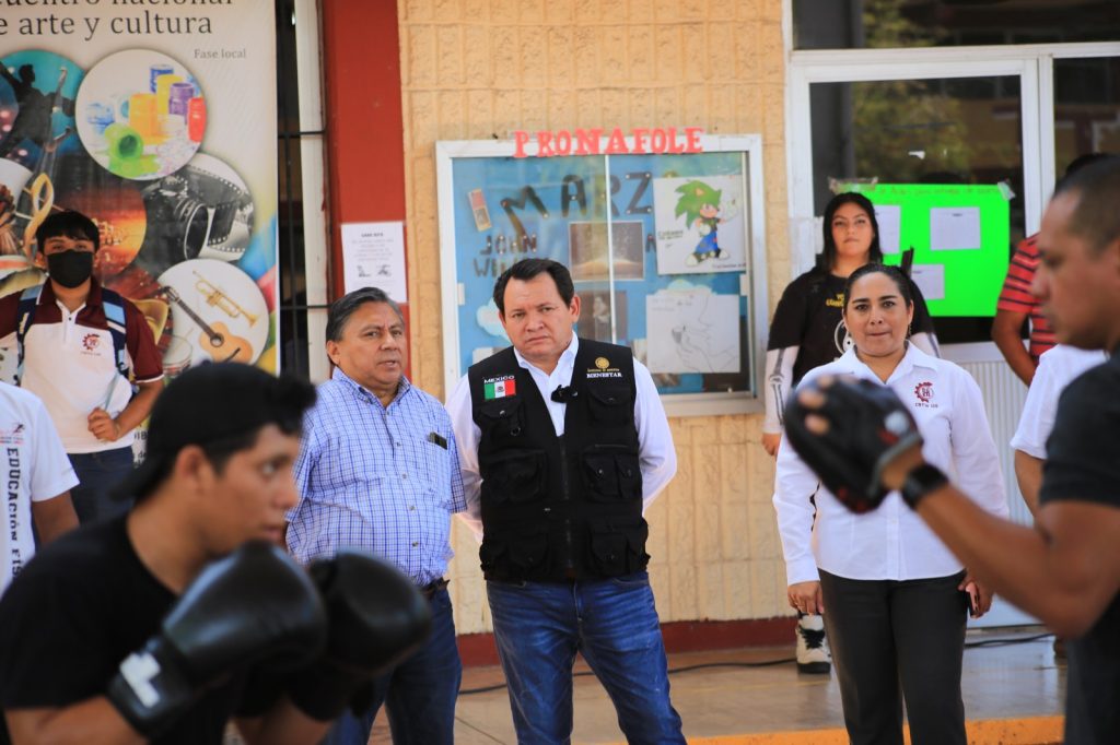 MÉRIDA, Yuc., 23 de mayo 2023.- En el marco de la celebración del día del estudiante, el Delegado del Gobierno federal en Yucatán, Mtro. Joaquín Díaz Mena, visitó el Cbtis 120 de Mérida donde presenció una demostración de boxeo que realizó el campeón mundial Guty Espadas Jr., promoviendo a los alumnos de ese plantel la activación física a través del deporte. Acompañó en el acto al Delegado el representante del SEP federal en el estado, Juan Balam Várguez.