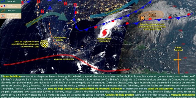 El huracán Milton continuará alejándose de la península de Yucatán, sin embargo, su amplia circulación favorecerá el ingreso de humedad desde el golfo de México hacia el interior de la región, por lo que se prevén nublados dispersos, con probabilidad de lloviznas con chubascos dispersos principalmente en el norte y centro de Quintana Roo, noreste, oriente y centro de Yucatán y el centro y suroeste de Campeche. Ambiente cálido a caluroso en el día y templado a cálido en la noche. Nuevo frente frío se desplazará sobre el golfo de México.