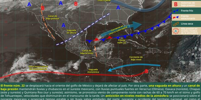Para las próximas 24 horas, una vaguada sobre la península y la divergencia en altura favorecerán lluvias puntuales fuertes en el centro y sur de Yucatán, el norte de Campeche y el sur de Quintana Roo.