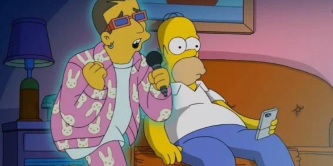 La familia llega al concierto de Bad Bunny y Homero tomó una selfie donde él sale sonriendo pero todos en su familia están enojados. Entonces Bad Bunny, el intérprete de “Ojitos lindos” agarró el teléfono Homero, lo tiró y lo pisó ayudando a que Homero y Marge se reconciliaran.