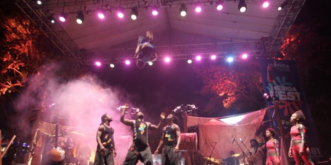 Mérida, Yucatán a 20 de enero de 2023.- Noche de acrobacias, música, danza y un espectáculo que hizo viajar a una aldea africana se vivió en el #MéridaFest2023 con el espectáculo “Afrique en Cirque”. Los acrobátas de la Compañía Kalabanté, de Canadá, se movían al ritmo de la música, mostrando energía, flexibilidad e intensidad en el Remate del Paseo de Montejo.